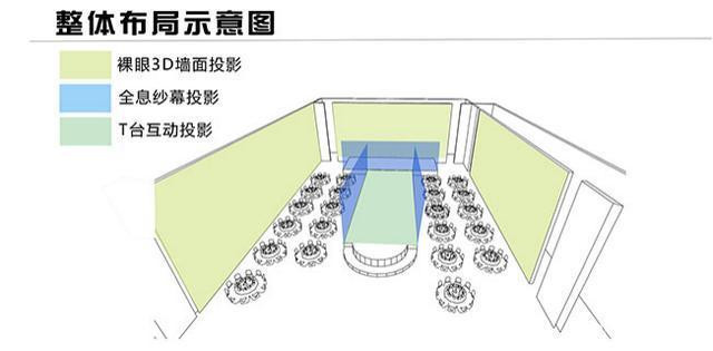 在宴會廳的實際應用中,又分為720度和360度投影。多以宴會廳墻體作為投影載體,結(jié)合4D動畫使宴會廳空間呈現(xiàn)動態(tài)的3D立體效果。立體成像在全息宴會廳中具有可變化性,可以根據(jù)不同的需求來變化不同的場景。